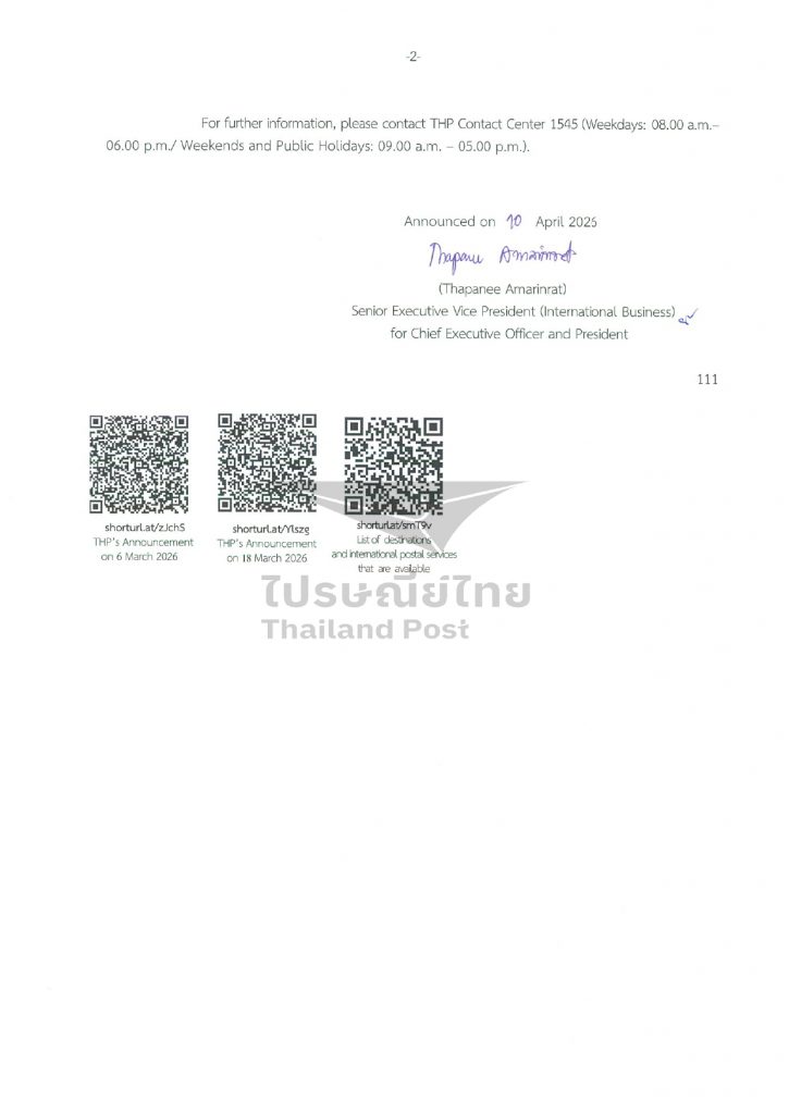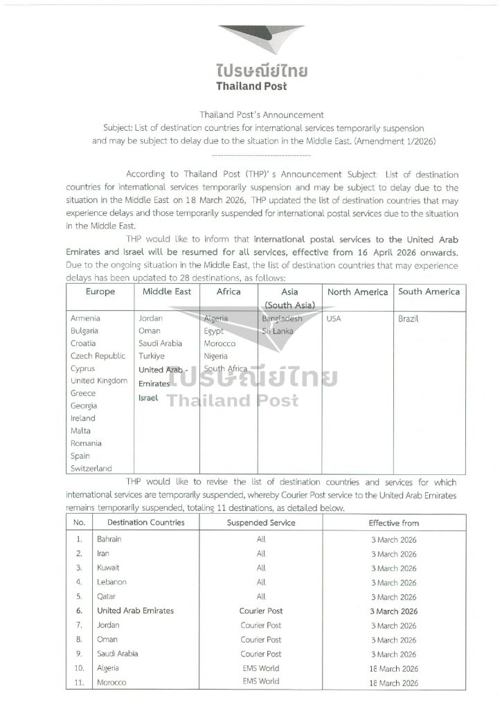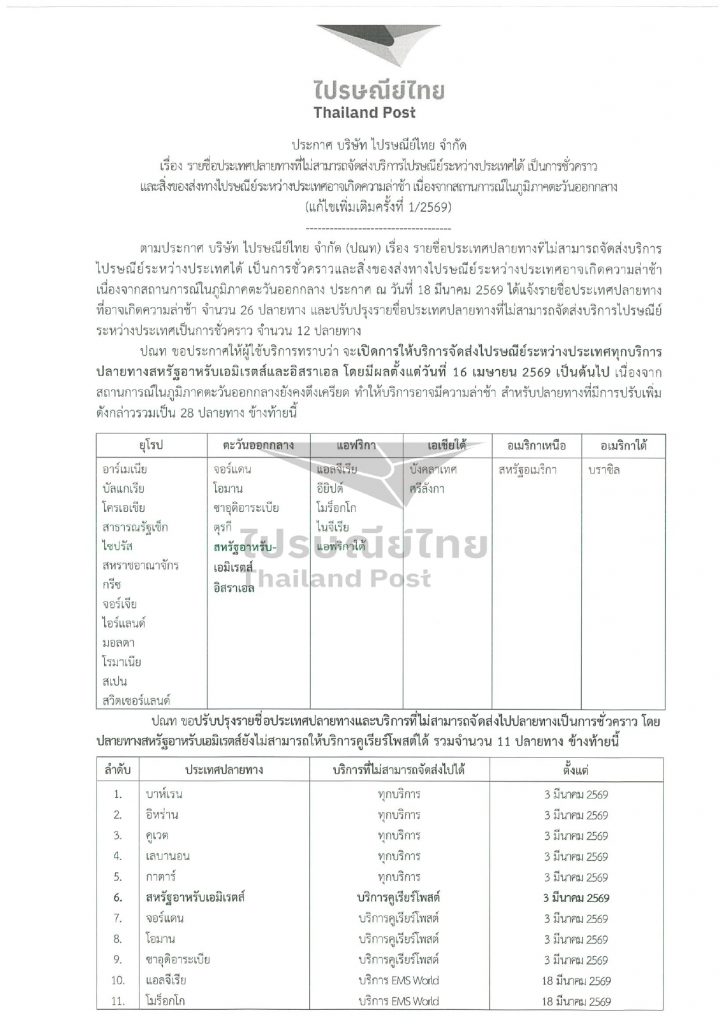 ทั้งนี้ การให้บริการไปรษณีย์ระหว่างประเทศยังคงได้รับผลกระทบในบางปลายทาง โดยมี