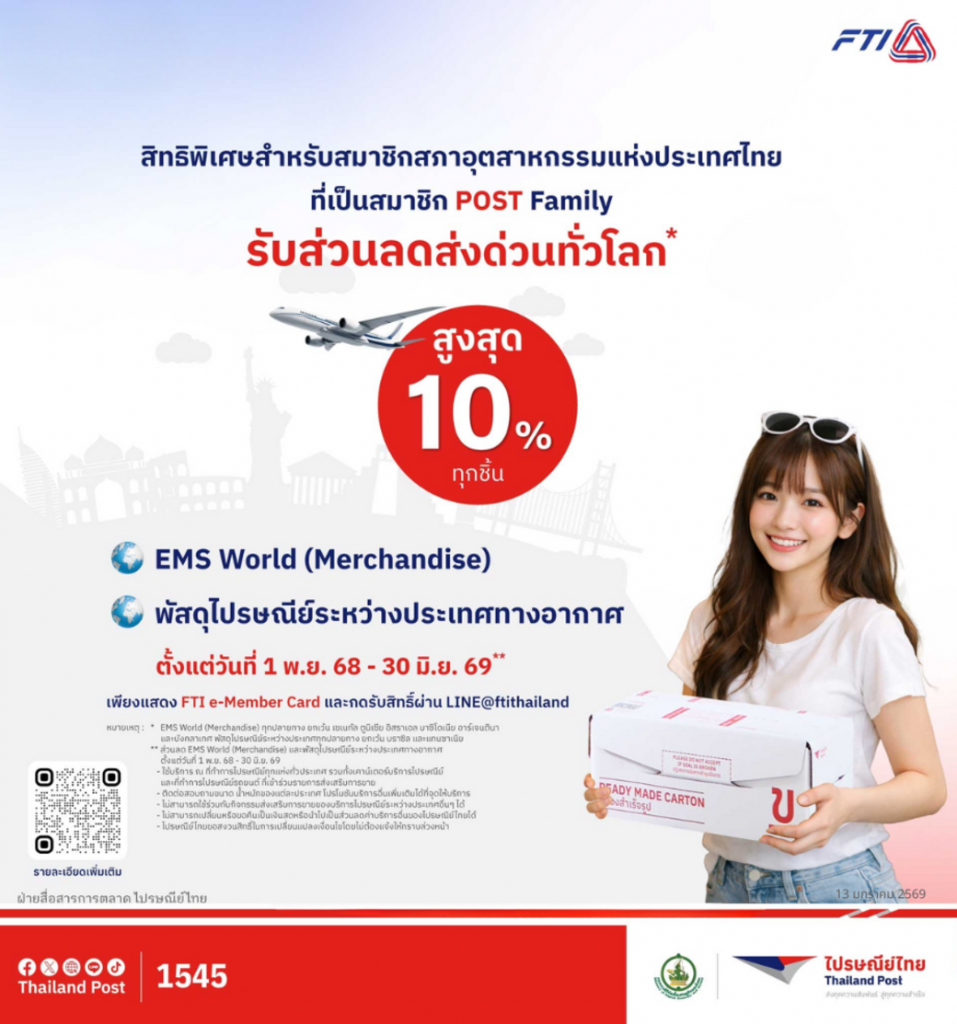 สมาชิกสภาอุตสาหกรรมแห่งประเทศไทยที่เป็นสมาชิก POST Family รับส่วนลดค่าส่งไปต่างประเทศ สำหรับบริการ EMS World (Merchandise) และบริการพัสดุไปรษณีย์ระหว่างประเทศทางอากาศ