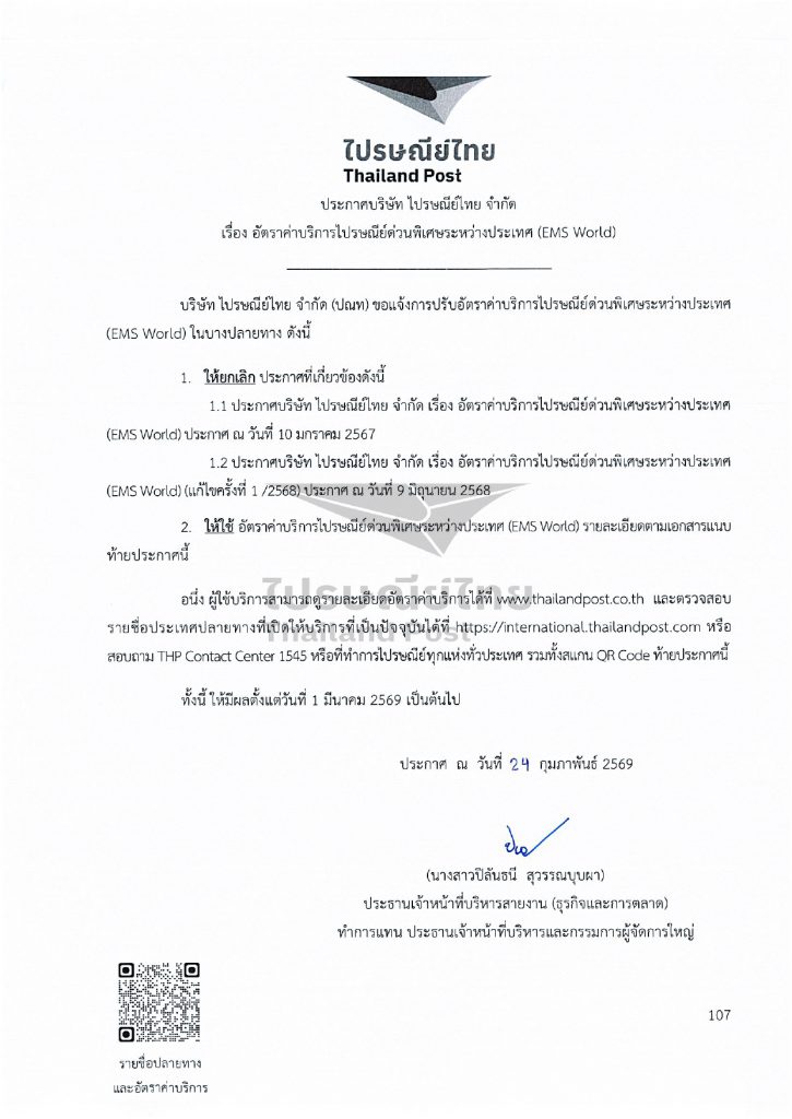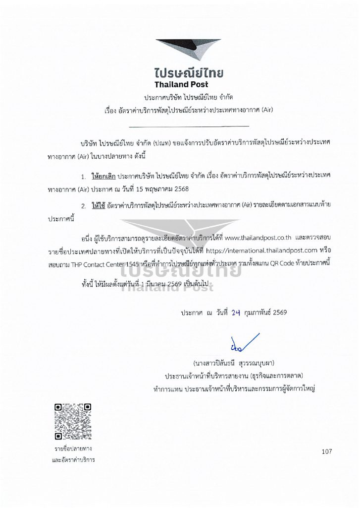 ทั้งนี้ อัตราค่าบริการใหม่จะมีผลบังคับใช้ตั้งแต่วันที่ 1 มีนาคม 2569 เป็นต้นไป
