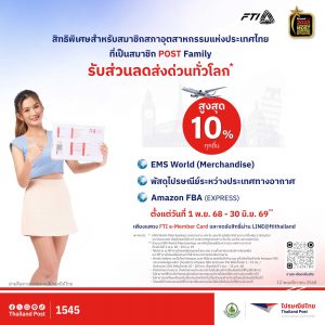 โปรพิเศษ…สมาชิกสภาอุตสาหกรรมแห่งประเทศไทยที่เป็นสมาชิก POST Family รับส่วนลดส่งด่วนทั่วโลก* ทุกชิ้น ทุกพิกัดน้ำหนัก พฤศจิกายน 12, 2568 อ่านเพิ่มเติม »