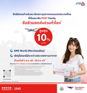 โปรพิเศษ…สมาชิกสภาอุตสาหกรรมแห่งประเทศไทยที่เป็นสมาชิก POST Family รับส่วนลดส่งด่วนทั่วโลก* ทุกชิ้น ทุกพิกัดน้ำหนัก มกราคม 23, 2569 อ่านเพิ่มเติม »